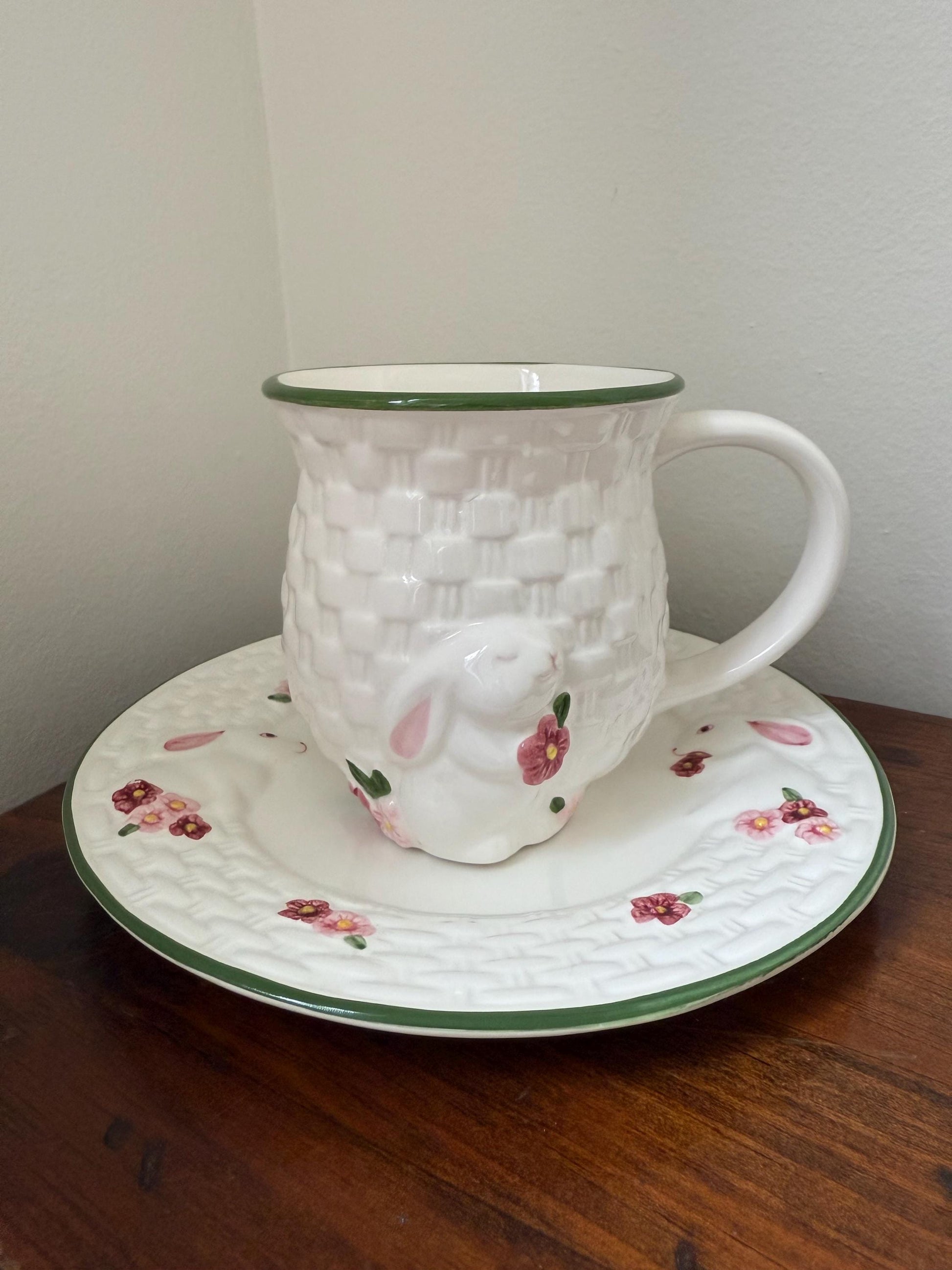 Vintage Avon bunny mug and saucer set features an adorable bunny and floral design. The saucer measures 7 inches across. Perfect for a cottage style kitchen or bunny lover!